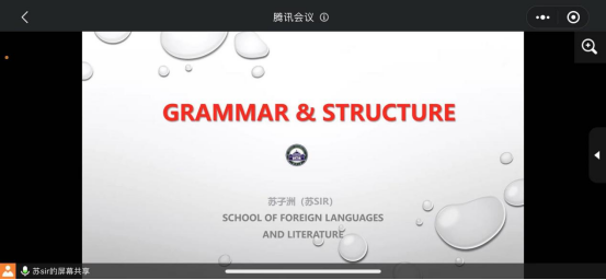 外语学院大学英语部教师第四支部组织委员苏子洲老师。10月21日19:30分,苏老师准时通过腾讯会议为学生开展题为“语法结构123”的讲座。
