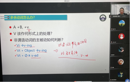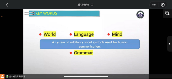 苏老师首先从语言的定义以及语言与世界、语言与心灵之间的关系展开,指出语法的作用就是帮助我们编码(encode),建构句子;以及解码(decode),获取意义。许多同学觉得语法比较困难的原因是不知道英文句子的核心结构,不懂得如何划分句子成分。针对这一实际困难,苏老师指出,句子的核心结构就是A名词性+B动词性,其中的动词在该句中必须具有唯一性。所有的英文句子都是用这种核心结构,通过并列和从属等不同的组合方式组合到一起的。接着苏老师解释既然动词唯一,那多余的动词该怎么处理?非谓语动词的主被动如何判断?这个问题困扰着无数学生,使得他们无论是在阅读中需要切分长难句时,还是在写作中需要注意语法结构时,都头痛不已,找不到简单而行之有效的解决办法。最后,苏老师还进一步阐释了句子名词性部分6种不同的修饰语表达法,动词性部分5种修饰语表示法,帮助学生从主干到细节更深层地理解英语长难句。