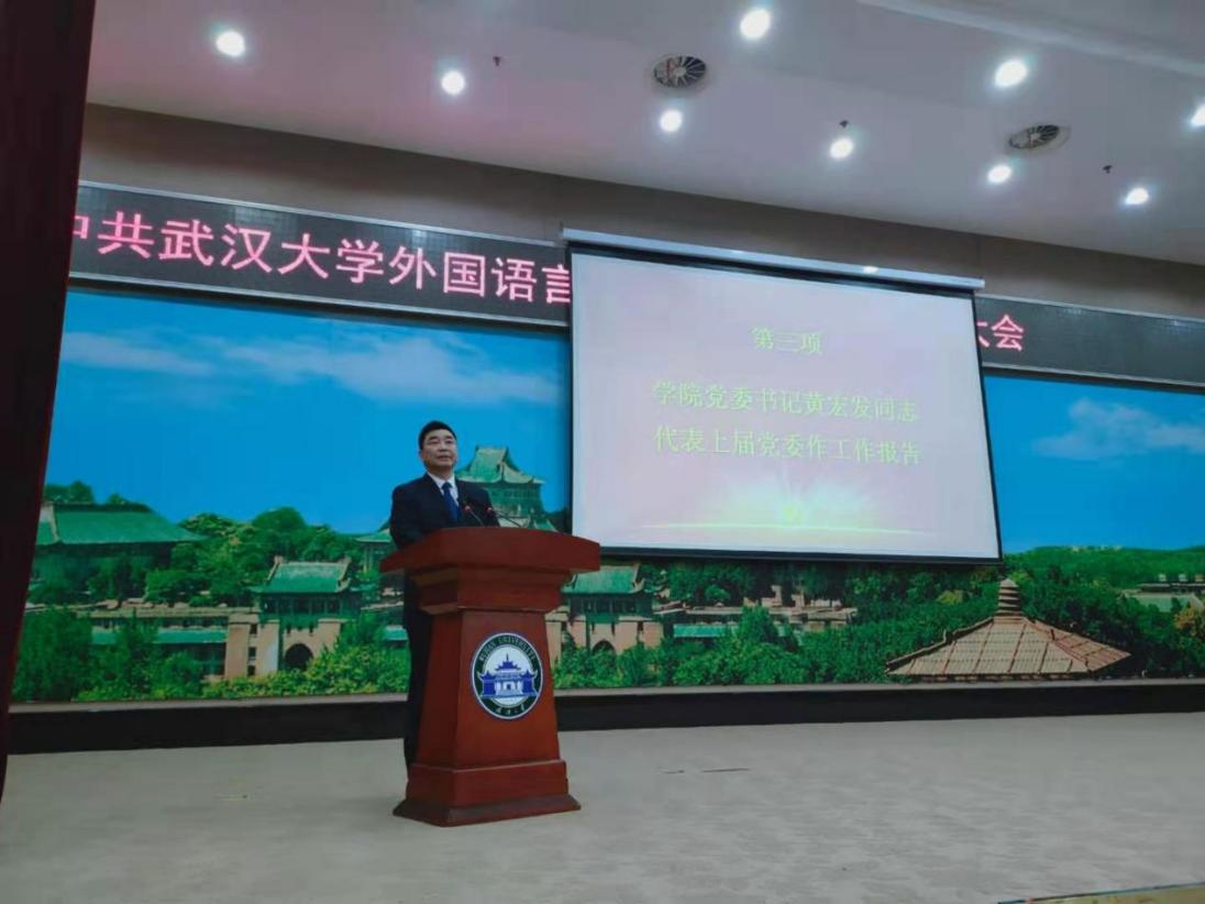 接着进入大会第三项,学院党委书记黄宏发同志代表上届党委作工作报告。在对过去五年的回顾与总结中,他提到:第一,学院党委坚持从严管党治党,全面发挥党建政治引领作用,突出抓好党的政治建设,强化班子和干部队伍建设,牢牢把握意识形态工作领导权,持续深化作风建设工作;第二,彰显特色多方联动,不断加强基层组织的规范化建设,创新形式激活力,全面打造高品质的基层党支部活动,加强教代会、工会、统战、离退休等工作,扎实推动基层党建落实落细;第三,学院统筹规划中心工作,在学科建设、教学工作、科学研究、队伍建设、外事交流、人才培养、管理服务方面扎实推进,成效显著。