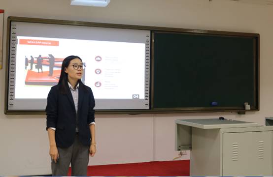 活动由三部分构成:首先,由“BC项目”学员、大英部青年教师文婷和苏子洲老师分享了项目培训成果和学习心得。其中,文老师从横向和纵向两个维度对EAP工作坊做了全面的回顾。纵向上,文老师概括了培训中所接触的所有教学技巧和教学活动;横向上,借助于布鲁姆的教学目标分类法,总结了“教什么”、“怎样教”、“怎样评价”的教学问题,并介绍了如何正确撰写课程大纲。也向老师们推荐了工作坊中接触到的各种网站资源和教学指导书籍。
