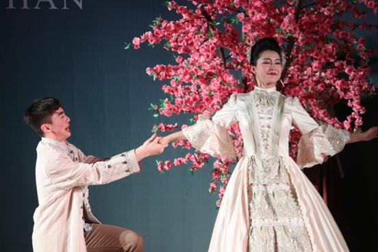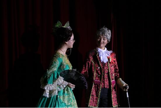 法语系的报送剧目选自18世纪法国古典喜剧大师马里沃的经典之作——《爱情偶遇游戏》(Jeu de l’amour et du hasard):富家小姐西尔维娅不满父亲奥尔贡先生擅自做主为自己定下婚约,遂决定与丫鬟丽塞特互换身份,以试探未婚夫——贵族公子德拉特,未曾想德拉特也用了同样的方法,让仆人阿尔干假扮自己考验女方。就这样上演了一出“上错花轿嫁对郎”的荒诞剧。错位的是人,不变的是情。最终,真爱战胜了一切,故事以男主爱上女主,男仆爱上女仆圆满结束。法语系选取的表演片段正是本剧高潮迭起的部分,互换身份的两对青年在父母眼光的注视下如何冲破外在与内心的双重束缚,勇敢追求自己的真爱。法语系领导对此次戏剧节的组织非常重视,赛前对剧目进行了精心的设计与编排,队员们更是铆足干劲,以必胜的决心投入备战,无数次的演练最终换来了完美的舞台演绎,整个表演行云流水般一气呵成,每个细节都恰到好处,将马里沃语言的生动、细腻与诙谐表现得淋漓尽致,保留古典庄严感的同时却又“笑”果十足,引得台下观众掌声阵阵,大呼入戏。