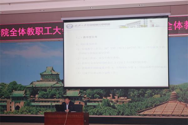 全体教职工大会在外院报告厅召开,校党委组织部副部长孙太怀出席会议,学院领导班子成员及全体教职工参加会议。会议由院党委书记黄宏发主持。