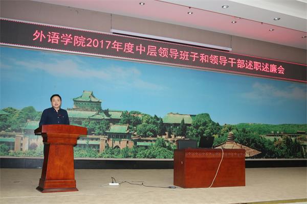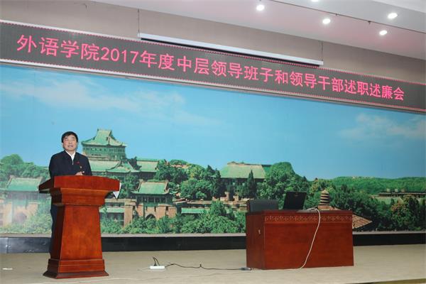 马院长首先代表学院党政领导班子进行述职,他从学科建设、教学工作、科研成果、外事交流、队伍建设、人才培养、党群工作和管理服务八个方面报告了学院2017年度的工作成绩和不足,并表示2018年学院领导班子将紧紧围绕“双一流”建设目标,深化绩效改革,聚焦“队伍建设和学科建设”,进一步求真务实、开拓进取,带领全院师生员工为学校和学院的发展做出新的贡献。