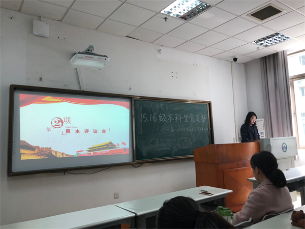 会议的第二项进程是民主评议。支部共有4名正式党员,19名预备党员。民主评议会采取个人自评与党员互评相结合的模式,分成两大板块:对正式党员的评议及对预备党员进行评议。第一板块,正式党员上台发表个人陈述,每一位正式党员完成陈述后,支部一位成员对其进行评议。在自我评议中,欧静文和阳文喆分别从学习、生活、工作三个方面阐述了自己的进步与不足,林中花结合其学生会工作经验进行了自我反省,崔智浩也结合两会时事,阐述了自己对学习政策文件的看法。预备党员刘倩倩、刘相廷、魏也娜、费凯澜客观公正地对四名党员进行了评议。经民主投票,林中花评议等级优秀,其他三名正式党员为合格等级。