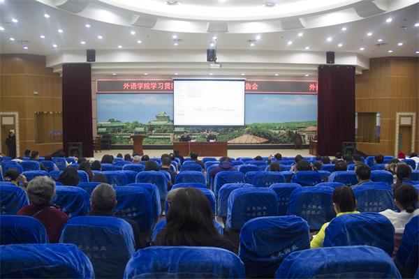十九大精神宣讲团成员、校党委研工部部长楚龙强为外院全体师生党员作题为《深刻把握日益走近世界舞台中心的新时代,为伟大事业培养世界一流人才》的学习报告。外语学院党委书记黄宏发主持报告会。
