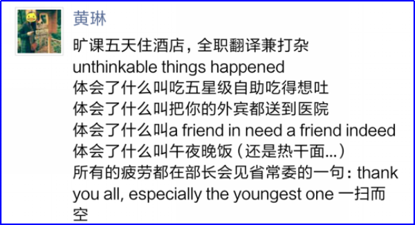 外语学院的志愿者联络员们与他们所接待的外宾朝夕相处,能够做到在正式场合有礼有节,在突发情况下处变不惊,在生活出行安排中事无巨细。开幕式前东湖宾馆入口车辆禁行,是志愿者们顶着烈日在几个入口与会议中心间反复奔走,测量步行时间,绘制路线图;重要外宾突发高血压、腿部不适,是志愿者们第一时间拨打120送他们去医院,在酒店悉心照顾;一位外宾希望在中国买一个“助行器”,是志愿者们深夜在微信群里讨论最佳的购买方式……志愿者们的服务得到了组委会和接待单位的高度评价,他们纷纷表示已经“离不开”我们的志愿者。来自各国政府和商界的嘉宾们更是与志愿者们建立了深厚的友谊,依依惜别之时,他们表示这些志愿者是自己在中国“最美丽的相遇”。