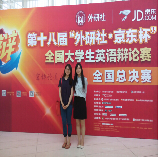 翻译系13级本科生方思媛和严曦同学组成的代表队首次参加全国 大学生英语辩论赛,在总决赛中,通过七天八轮激烈的积分赛,与北京大学、清华大学、复旦大学等全国知名高校的对手同台竞技,最终在百余支队伍中胜出,获得三等奖的好成绩。