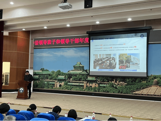 2023年度中层领导班子和领导干部考核述职述廉大会于学院一楼报告厅召开,党委书记黄宏发主持大会,全体教职工参加大会。