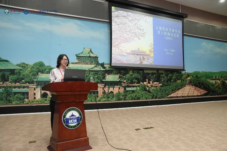 何晓静副教授围绕全国西班牙语专业四、八级测试进行了全面总结。她首先对考试的整体情况进行了深入分析和对比,包括考点数量、考生规模、应届生参与率及专业设置调整等方面的动态变化。她强调,考试内容的设计更加注重对学生综合语言能力的考察,新增专业考点的设置体现了西语教育的持续发展,同时强调语法和词汇作为语言学习核心要素应得到更多重视。此外,她特别提到,在教学过程中需进一步关注西语国家的社会文化知识和当下热点话题,将文化融入语言教学,以提升学生的文化敏感性和跨文化理解力;同时,应着力强化学生的语言输出能力,通过多样化的教学手段和实践机会,提升其实际运用语言的水平。