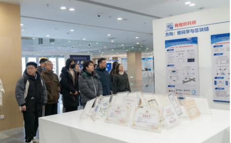 调研团队首先参观了国家网络安全基地的标志性建筑“新珈楼”。楼内陈设现代感十足,映入眼帘的巨幅基地规划图引人注目。学院老师详细讲解了基地的功能布局和未来发展方向,为学生展示了基地在建设“网络强国”征程中的战略地位。随后,师生们参观了网安学院的科研成果展区,从前沿网络安全理论的创新突破到实践技术的应用模型,琳琅满目的成果集中展现了网安学院强大的科研实力与深厚的学术底蕴。在这里,师生们不仅了解到网络安全领域的发展历程,还通过详实的文字记录和图文并茂的展示,感受到这一领域学者们不懈奋斗的精神与使命担当。此外,基地内优秀学生事迹展区极大地激励了外院学生,让他们对未来“外语+网安”职业发展方向充满信心与期待。