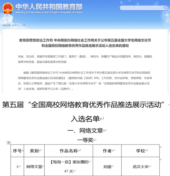 本科生辅导员刘迪的作品《朋友圈的47天》从报名的50000多件作品中脱颖而出,获网络文章类一等奖,轻小说