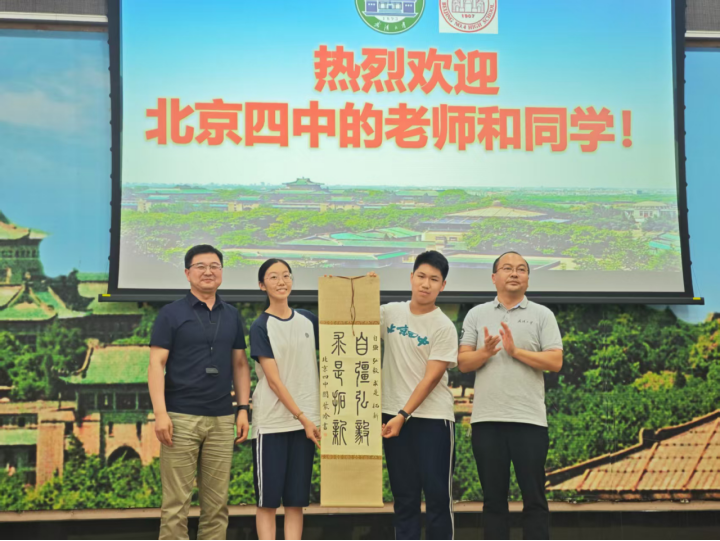 赠送学生手书“武大校训”书法作品,四中学生亦向志愿者赠送定制纪念品,表达对本次参访组织工作的感谢。
