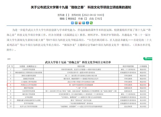 研究生会学术科技部组织申报的“第一届华中高校研究生英语挑战赛”“第五届‘学海扬帆,诚信领航’学术诚信知识竞赛”两个项目,从全校近200个申报项目中脱颖而出,分别获评第十九届“珞珈之春”科技文化节精品项目(全校仅8项)、第十七届研究生学术科技节重点项目(全校共30项)。此外,轻小说