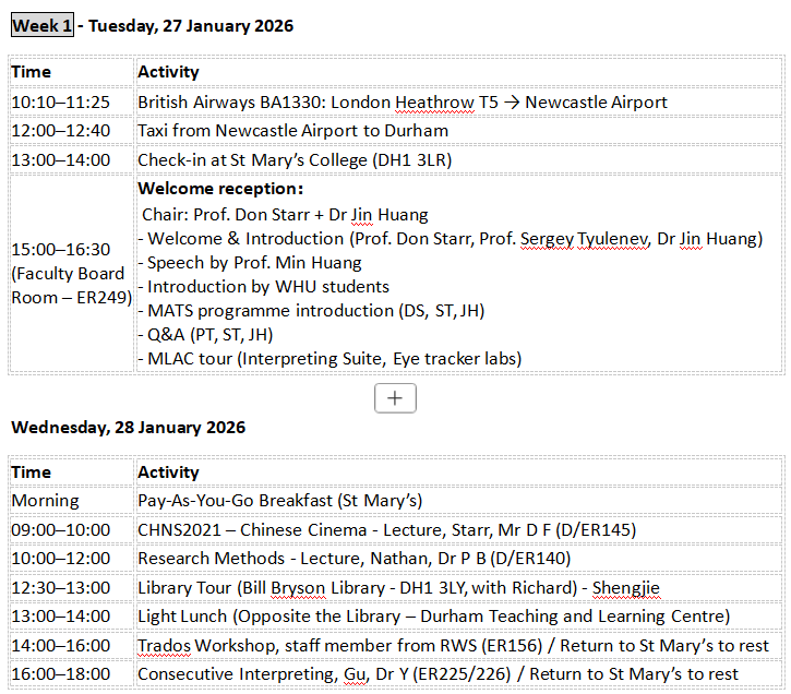 从学术准备到文化适应,从日程规划到生活细节,筹备团队逐一落实各项事宜。2026年1月26日,在黄敏老师的带领下,同学们历经近20个小时的长途飞行顺利抵达英国杜伦。入住历史悠久的St. Mary学院后,杜伦大学现代语言与文化学院为交流营举办了简朴热情的欢迎仪式,组织营员们参观了学校主图书馆、世界文化遗产杜伦古城堡和大教堂以及莎士比亚展,并在城堡安排了欢迎晚宴。此后,本次翻译与国际传播的跨文化交流之旅正式开启。