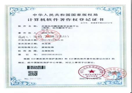 大学英语部赵玲副教授主持开发了“在线协同翻译教学实践平台”,为学生自主学习提供辅助手段,为培养应用型、复合型外语人才提供了有力支撑。2021年11月2日,该软件获得国家版权局颁发的计算机软件著作权。