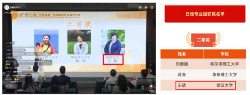 日文系王欣老师首次参赛就获得湖北赛区日语专业组特等奖,并成功晋级全国总决赛。经过激烈角逐,荣获日语专业组全国总决赛二等奖。