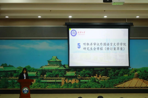 研究生会章程修订情况的报告》以及题为《风华外院,奋楫笃行践初心,踔厉奋发谱新篇》的第十八届研究生会工作报告,从组织改革、思想引领、学风建设、文体活动、新闻宣传、权益服务、就业指导等方面对第十八届研究生会的工作进行回顾与总结,代表第十八届研究生会对新一届研究生会提出了强化思想引领、创新工作方法、改善工作作风、提升服务能力的工作期许与展望。