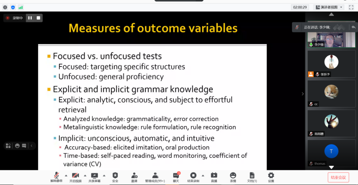 首先,李少锋老师介绍了语言学能的背景知识,包括语言学能的定义,及其主要分类,即外显学能和内隐学能,以及相关研究的主要类型,即自然情境下的研究和课堂情境下的研究。