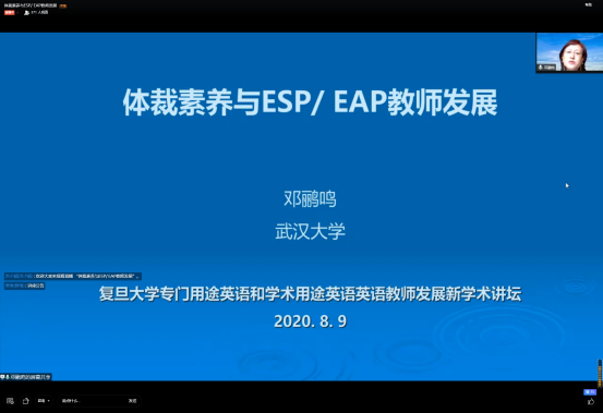 轻小说 邓鹂鸣教授应复旦大学新学术论坛特邀,于2020年8月9日出席本次云端高端论坛,并作了题为“体裁素养与ESP/ EAP教师发展”专题主旨报告,受到与会专家、一线参听学者及教师的一致好评。本次论坛由复旦大学出版社主办,近2000名学者和一线教师齐聚云端论坛,针对当前我国专门用途英语和学术用途英语教师发展的主要问题及新趋势展开探讨,以期更好地推动新文科背景下我国专门用途英语和学术用途英语教师发展。