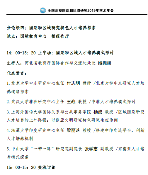 全国高校国别和区域研究2019年学术年会下设四个分论坛,分别以“高校国别和区域研究咨政服务”“国别和区域研究学科建设探讨”“国别和区域研究学术研讨交流”“国别和区域研究特色人才培养探索”为主题。