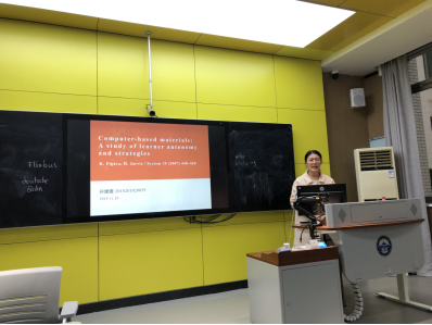 孙媛媛同学和大家分享了她近期阅读的一篇实证研究论文《Computer-based materials: A study of learner autonomy and strategies》。这篇论文探索了在计算机辅助语言学习环境下,学习者自学时的学习策略使用情况和学生的自主性。研究结果发现在计算机辅助语言学习环境下学生在学习过程中会频繁使用一语和同时处理多项任务。这两个显著的现象值得进一步调查研究。