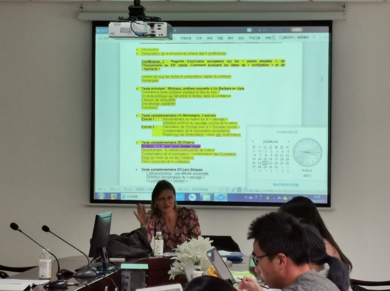 De Dampierre-Noiray教授此次讲学的内容围绕文化人类学及法语殖民地文学展开。第一讲主题为:投向他者的目光,“文明”与“野蛮”的对峙。通过欧洲自文艺复兴、启蒙时代直到20世纪的文学及文化人类学经典文本,分析欧洲“文明”人对其他民族的看法,尤其是不同作家包括蒙田、狄德罗、列维·施特劳斯、亨利·米修等对种族中心主义的批判反思。第二、第三讲为殖民地文学批评研究,涉及作家包括亨利·米修、米歇尔·布托尔、萨义德、喀麦隆历史学家阿席勒·穆班布、突尼斯小说家及文艺理论家阿尔贝特·梅米以及法国当代女作家安妮·艾尔诺。通过欧洲在亚洲及非洲(尤其是马格里布地区)殖民主义结束之时的经典文本,分析这一时期殖民主义文学批评倾向于后殖民主义思潮的特征,并从文本中透视文学表现与政治统治之间的关系,了解文学如何将殖民主义及其后果以艺术的手法表现出来。第四、第五讲探讨远离故土的殖民地法语作家尤其是诗人。De Dampierre-Noiray教授分别阐释和比对了阿尔贝特·梅米、大卫·迪奥普、伊曼·梅瑟尔、阿布戴拉提夫·拉阿比、帕特里克·夏穆瓦佐和默罕默德·卡西米的文本,引导听众探讨以下问题:何谓文化记忆的缺失?一个人是否能真正丢失、遗忘自己原本的文化归属?对小说家或诗人来说,从故土和母语中拔离意味着什么?如何远去,又如何归来?