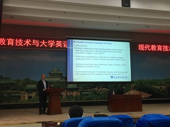 2018年11月1日下午,西交利物浦大学邹斌博士应大学英语部的邀请,在外语学院学术报告厅做了一场题为“现代教育技术与大学英语教学”的学术讲座。讲座由大学英语部主任程向莉老师主持。外语学院副院长游长松老师,大学英语部全体教师,英文系部分教师、外语学院访问学者,研究生等参加了讲座。