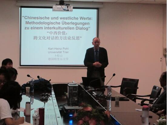 在紧接着的第二场讲座中,Pohl教授从中西对比的视角对跨文化对话的方法论进行了细致阐述、分析以及反思。在演讲的第一部分他首先向我们介绍了文化、价值、认同、跨文化对话等一些基本概念,然后讲述了关于方法论的十二个不同方面的思考,接着又进一步分析了跨文化对话中的四个要点。在第二部分中Pohl教授主要讲述了中西方不同的价值体系,并对此进行了对比分析。第三、第四部分提到了寻求共同理念的跨文化普世概念和对于不同文化的一种开放、接纳的态度。最后他提出了自己对于跨文化对话独特的见解,为我们对于跨文化交流的思考和研究提供了新的视角与灵感。
