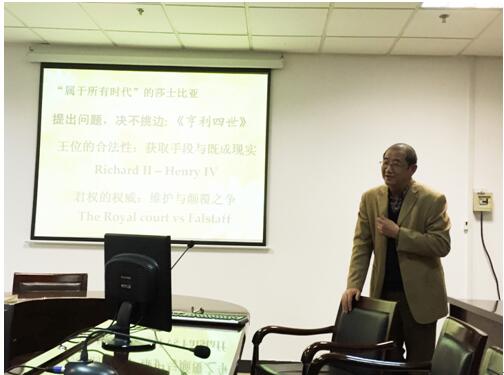 第二场讲座于12月18日上午10时在外语学院英文系会议室3055召开。本次讲座由英文系系主任朱宾忠教授和熊杰平老师共同主持,讲座题为“《亨利五世》舞台版翻译的实践与思考”。本场讲座,张冲教授分享了他为英国皇家莎剧团翻译中文剧本台词的经历。张教授对比了早年港台版和自己翻译的两个版本。正是因为内地观众和港台观众在文化背景和语言表达上存在诸多不同,张教授重新翻译了《亨利五世》的剧本台词。张教授认为好的莎剧翻译应该遵循以下三条原则:Theatrically viable(适合舞台),Actor friendly(演员易上口),Audience accessible(观众易懂)。正是基于这三条翻译原则,张教授翻译版既忠实原著,又适合于舞台演出。张教授提出莎士比亚不是用诗写剧,而是用诗体在创作。因此,如何翻译莎剧中的五步抑扬格成为难题。张教授认为应该遵循“以顿代步”原则。利用中文里五个停顿来代替英文里的五个音步,既保留了莎剧特色,又符合中国观众的口味。