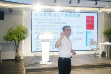 张斌博士首先从认知构式语法的产生背景出发,重点介绍了对认知构式语法产生重要影响的四个理论来源:描写语言学、生成语言学、词语法以及框架语言学。张斌博士指出,认知构式语法中把通过习得获取的形式和意义的组合看作是“构式”的构式观打破了以索绪尔为代表的欧洲结构主义对于语言符号传统在语义和句法层面二分的理解,这种“基于使用(gebrauchbasiert/usage-based)”的语法主张近年来也不断受到国内外学者的重视和青睐。