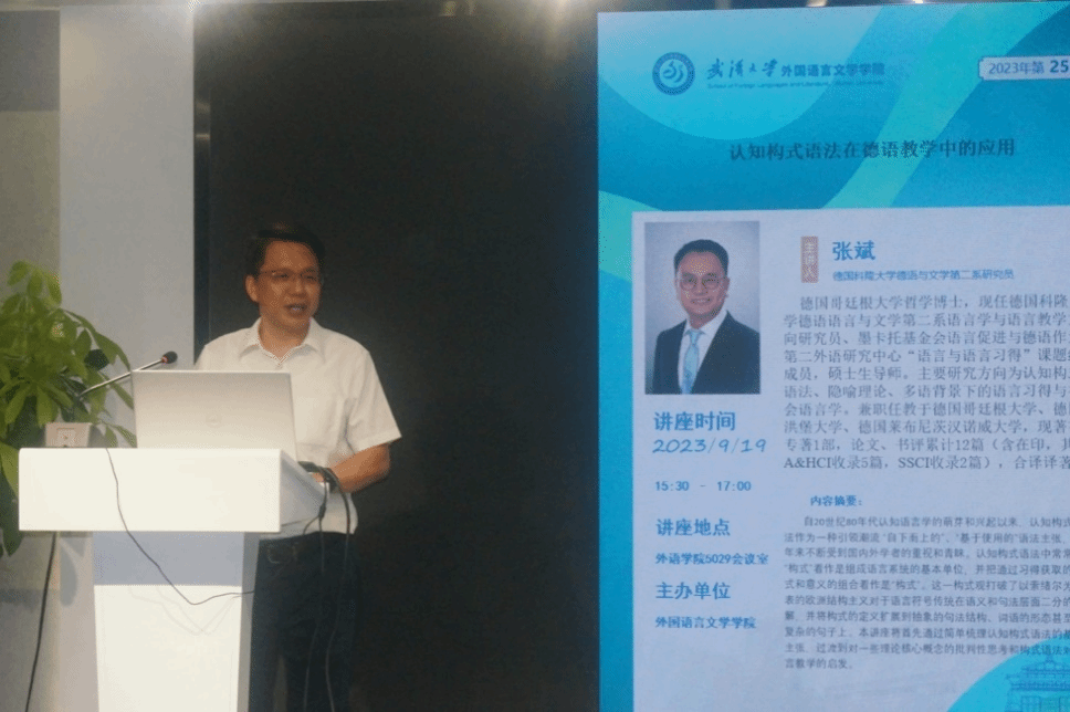 2023年9月19号下午,德国科隆大学德语语言与文学第二系研究员张斌博士应邀为外语学院师生在5029会议室开展了主题为“认知构式语法在德语教学中的应用”的讲座。该讲座由德语系主任徐琼星老师主持,外语学院黄宏发书记、包向飞副院长出席,德语系鲁晓雁、张申威等多位老师与学生参加了此次讲座。
