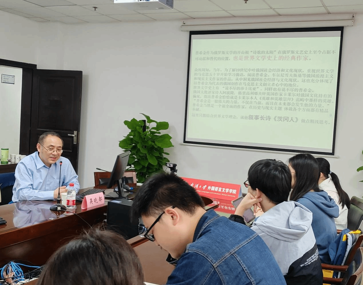 吴晓都教授从关于世界文学理念、普希金与《茨冈人》《茨冈人》与《卡门》三个方面对普希金及世界文学理念进行了阐释。吴晓都教授以诙谐幽默的语言,从普希金的生平谈起,层层深入,对普希金的诗歌理念娓娓道来,并指出马克思恩格斯实际上是最早从经济全球化的角度理解与阐释世界文学这个理念。世界文学在民族文化中心的基石上,在各民族文化的深度融合中,将获得更加广阔的发展远景。吴晓都教授深厚的文化涵养、有趣的语言艺术受到了在场师生的广泛喜爱与欢迎。