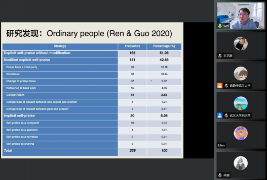 外语学院师生开展线上讲座,主题是“社交媒体自夸现象的语用研究”。该讲座由英文系刘庆荣老师主持,外语学院马萧院长、张妍岩副院长、程向莉副院长、邓鹂鸣教授和李丹丽老师等多名教师和研究生在线下与线上同步观看讲座,线上吸引了来自国内多所高校的300名听众参与交流。