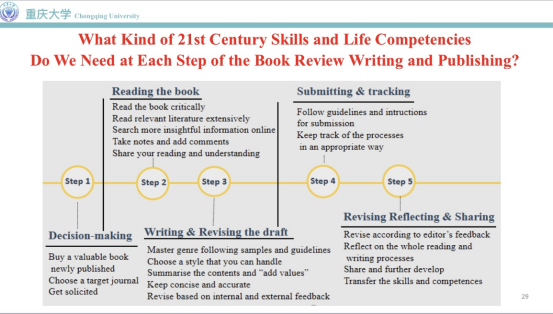 辜教授接下来总结了书评写作的五个步骤。第一步是“做出决定”,选择一本合适的学术著作;第二步是“阅读”,书评写作者至少要进行四轮阅读,包括阅读原著、阅读原著作者的其他相关文献、阅读其他作者在该领域的相关研究文献、再次阅读原著;第三步是“写作、修改书评”;第四步是“交稿与跟进审稿”;第五步是“修改、反思与分享”。辜教授强调:“能将写书评的能力迁移到其它活动中才是成功的”。最后,辜教授分享了她所指导的多名学生的学术历程。