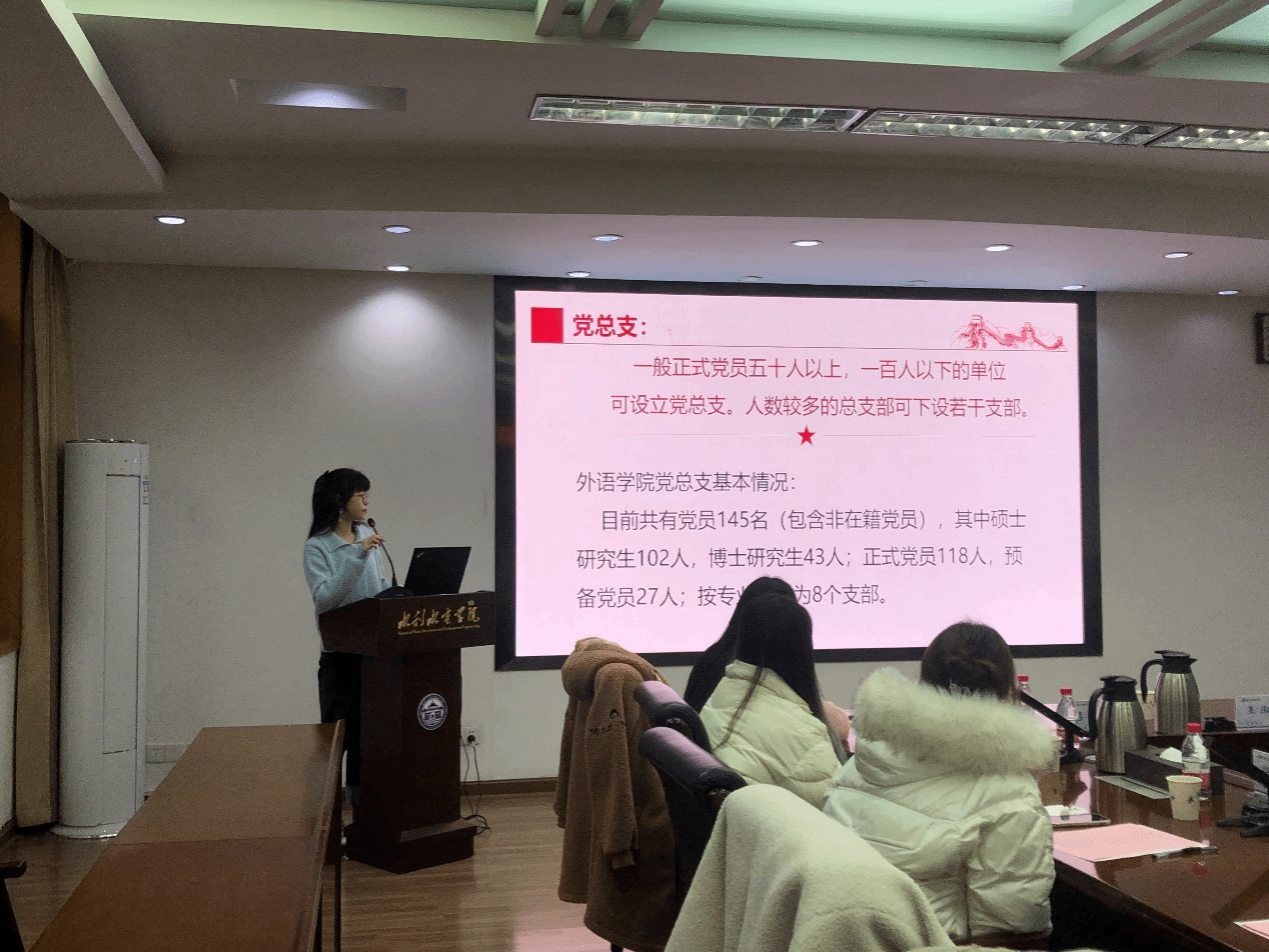 研究生党总支学生常务副书记林玉红介绍研究生党建工作情况。林玉红同学从基本架构、部分活动、宣传平台三个方面展开介绍。林玉红同学首先介绍了外语学院党总支的组织架构,展示了外语学院党总支举办的系列活动:结合外语学科特色广泛开展主题党日活动;开展躬行驿站系列活动,针对出国境交流项目进行答疑;组织党员发展培训会暨党务知识竞赛、研究生党支部风采大赛、毕业生党员教育活动等。外语学院党总支结合学科特色,开展多语种讲党史活动,推出青春献党的二十大——二十大金句用外语这young说,以及双语说中国等微信公众号特色推文,旨在用外语讲好中国故事,学习中国理论,传递中国思想。同时,党总支积极参与学校举办的活动,如第十三届历史剧创意表演大赛。最后,林玉红同学介绍了外语学院党总支的主要宣传平台——珞珈外研公众号,依托此平台开展相关宣传工作。