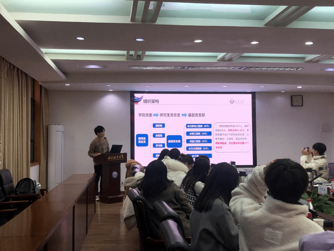 水利水电学院研究生党总支学生负责人童政介绍研究生党建工作情况。童政同学从组织建设、制度创新、特色活动三个方面展开介绍。首先,童政同学详细介绍了水院党总支的组织架构、内部结构及其工作职责、运行机制。其次,在制度创新方面,介绍了党总支各项创新制度:组织架构设立支部书记联席会制度、心理委员制度等,党员发展实行入党推优考核制、党员预审发展差额制等,支部管理实行实验室卫生检查制度、实验室周签制度等。特色活动方面,详细展示了示范党支部(文明实验室)评比活动,党支部红歌合唱比赛、党支部风采大赛以及各类主题实践教育活动。
