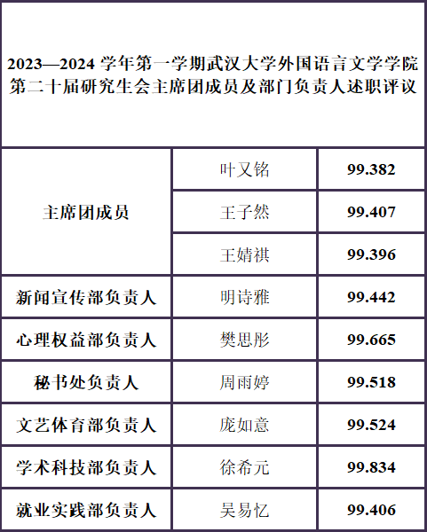 研究生会2023-2024学年第一学期述职方案》关于骨干考核的相关要求,现将主席团成员及部门负责人评议考核结果公示如下: