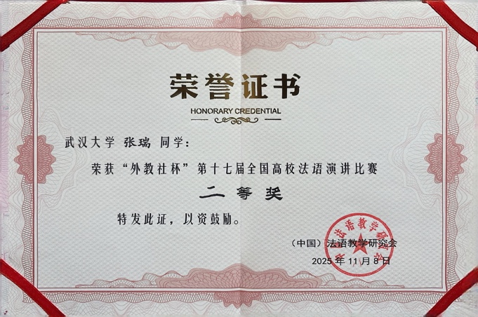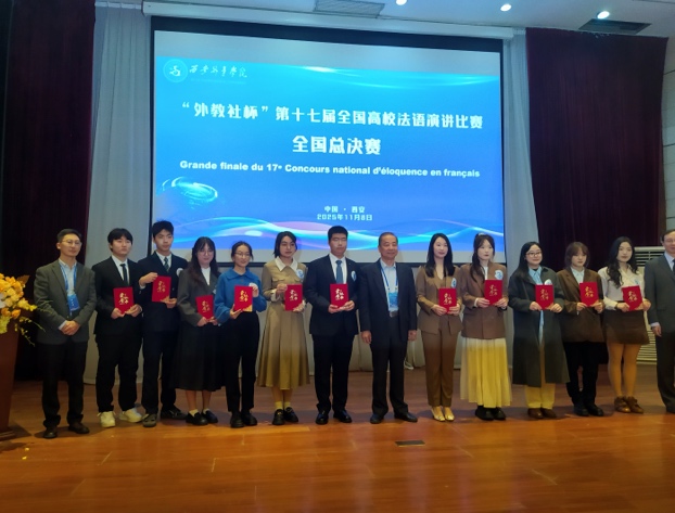 这份沉甸甸的荣誉背后,是参赛学生的不懈努力和老师们的辛苦付出。在苏昉和姜俊钦两位老师的精心指导下,张瑞同学从主题解读、稿件打磨到演讲技巧、仪态管理,进行反复演练和持续优化,最终闯入总决赛。她的出色表现充分彰显了法语学子扎实的专业素养、卓越的综合能力和积极向上的精神风貌。
