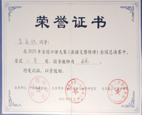 (通讯员:李高欣)近日,历时三个月的2025年全国口译大赛在北京圆满落幕。本次大赛于2025年12月27日正式启动,吸引了全国390余所院校的4000余名选手积极参与,最终199名选手脱颖而出,荣获各类奖项。大赛首次从英语单一语种拓展至法语、俄语、西班牙语等8个语种,精准对接国家对外交流多元化对多语种人才的旺盛需求,是国内口译界最具权威性和影响力的专业赛事之一。
