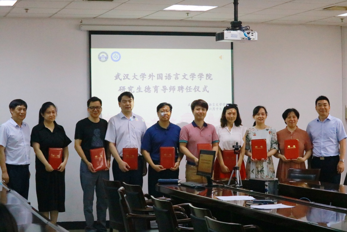 2021年6月17日中午,武汉大学外国语言文学学院研究生德育导师聘任仪式在学院3008会议室顺利举行。外国语言文学学院党委书记黄宏发、院长马萧、各系系主任、学院研究生工作办公室老师以及受聘老师参加了此次仪式。会议由学院党委副书记孙燕老师主持。