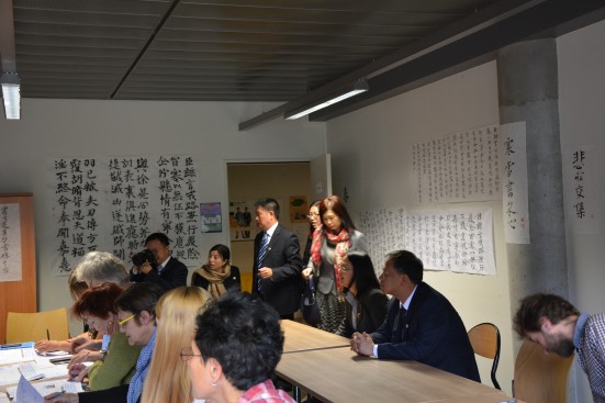 李斐副校长一行还参观了巴黎七大孔子学院并听取了孔子学院中方院长周汉斌教授的工作汇报。李斐副校长高度赞扬了孔子学院的工作。在与孔子学院教师们亲切坐谈后,李斐副校长还旁听了汉语课程。
