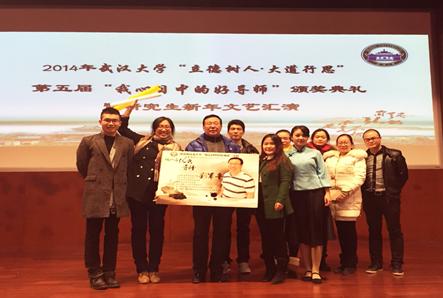 本次颁奖晚会由各院研究生会选送丰富多彩的文艺节目,有舞蹈、乐器、朗诵、小品等,展现了我校研究生的多姿风采。而 “我心目中的好导师”的颁奖环节更是把晚会推向最高潮!外语学院刘军平教授秉承武大自强弘毅、求是拓新的精神,不仅学术造诣高深,而且潜心关注学生发展,视学生如子女。为感念师恩,我院同学组成后援团,积极踊跃发通过征文投稿、网络投票、现场投票等环节支持刘军平教授,最终荣幸地登上了全校十大好导师的颁奖的舞台,由其学生王梦恬颁奖。