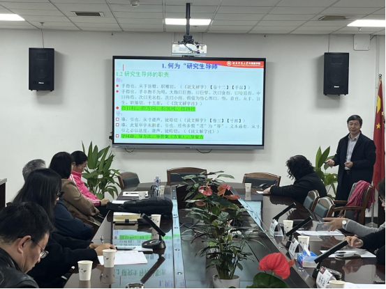 余承法教授以研究生导师的一“责”多“人”为主题,强调了新时代研究生导师承担的重要责任。余教授从翻译学科的角度,提到翻译能力应与国际传播发展相协调。余教授鼓励各位老师做好研究生学术研究的指路人,对研究生进行差异化指导,在严格要求学生的同时,也要注意关爱学生的学习生活。