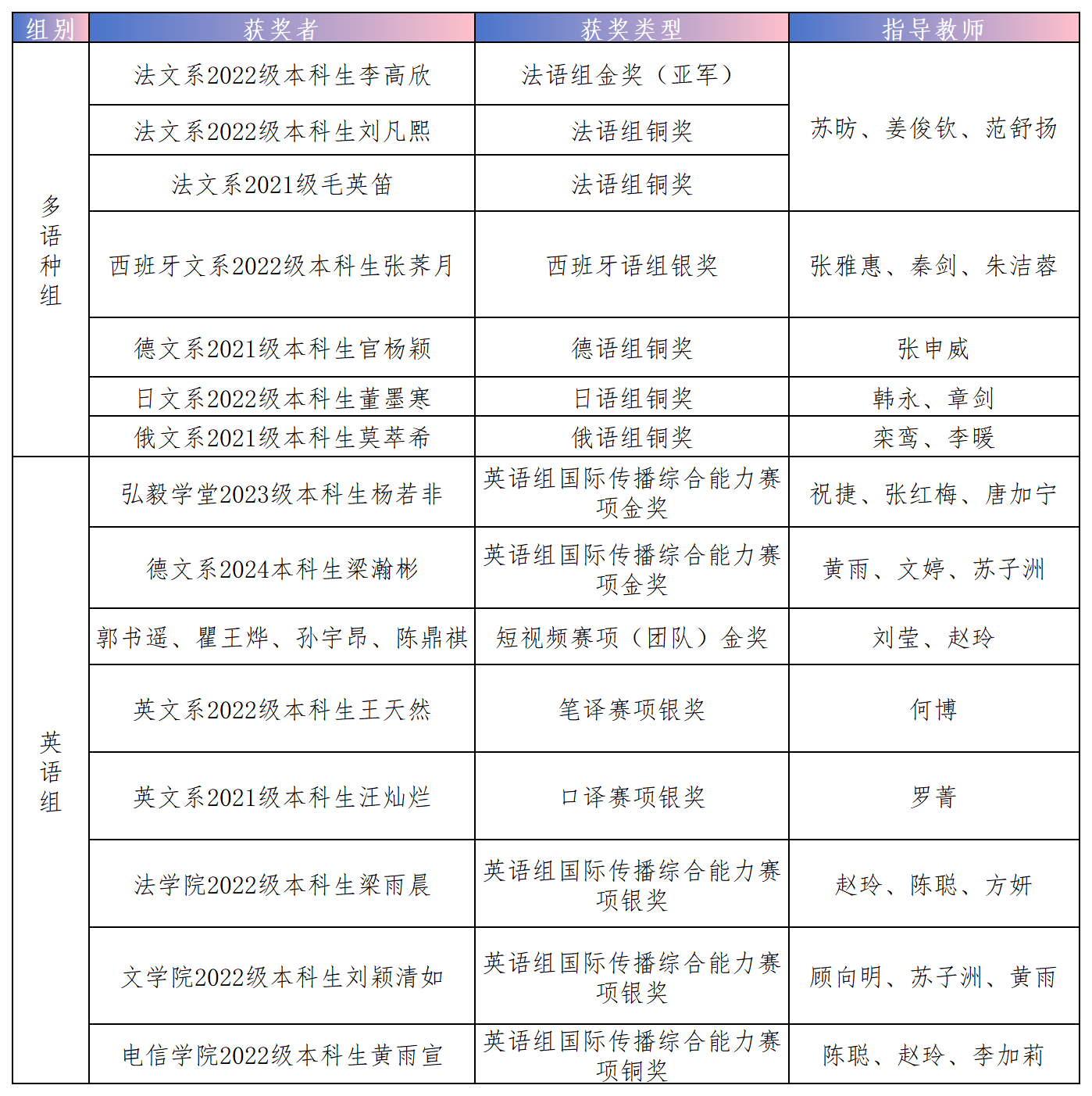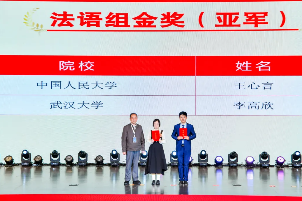 大赛启动后,我院积极动员学生报名,各专业及大学外语部20余名教师有针对性地指导学生备赛。经过校赛和省赛选拔,多名选手入围国赛并最终取得优异成绩。在英语组赛项中,在黄雨、文婷、苏子洲、祝捷、张红梅、唐加宁、刘莹、赵玲等老师指导下,武大学子在英语笔译、口译和英语组国际传播综合能力和短视频赛项中,取得三金四银的好成绩。其中2024级德语专业的梁瀚彬同学斩获英语组国际传播综合能力赛项国赛金奖,作为小语种大一新生,梁瀚彬同学在多所高校的英专生当中一路过关斩将,最终脱颖而出,取得优异成绩。在多语种赛项中,在苏昉、姜俊钦、范舒扬、张雅惠、秦剑、朱洁蓉等老师的指导下,外院学子表现突出,共荣获国赛金奖1项(法语组亚军)银奖1项(西语)。