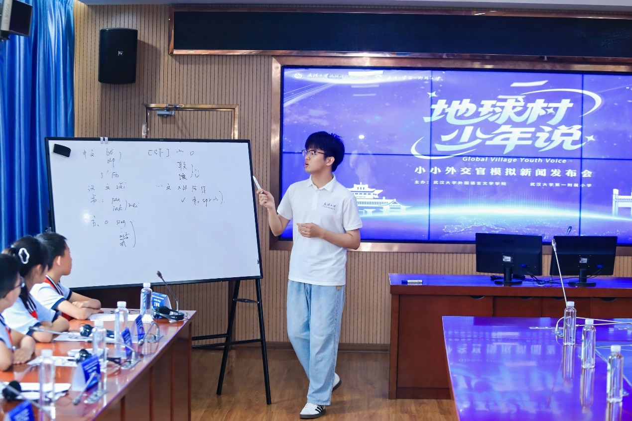 2025年6月11日下午,由武汉大学外国语言文学学院与武汉大学第一附属小学联合主办,武汉大学外国语言文学学院“青年马克思主义者培养工程”培训班与口译队协办的“地球村少年说·小小外交官模拟新闻发布会”在武汉大学外国语言文学学院4016同声传译实验室圆满举行。此次活动作为武汉大学校团委“青春共赴教育强国”思政课系列活动的重要组成部分,旨在通过沉浸式体验,培养青少年的国际视野与跨文化交流能力,为新时代青少年成长注入新动力。
