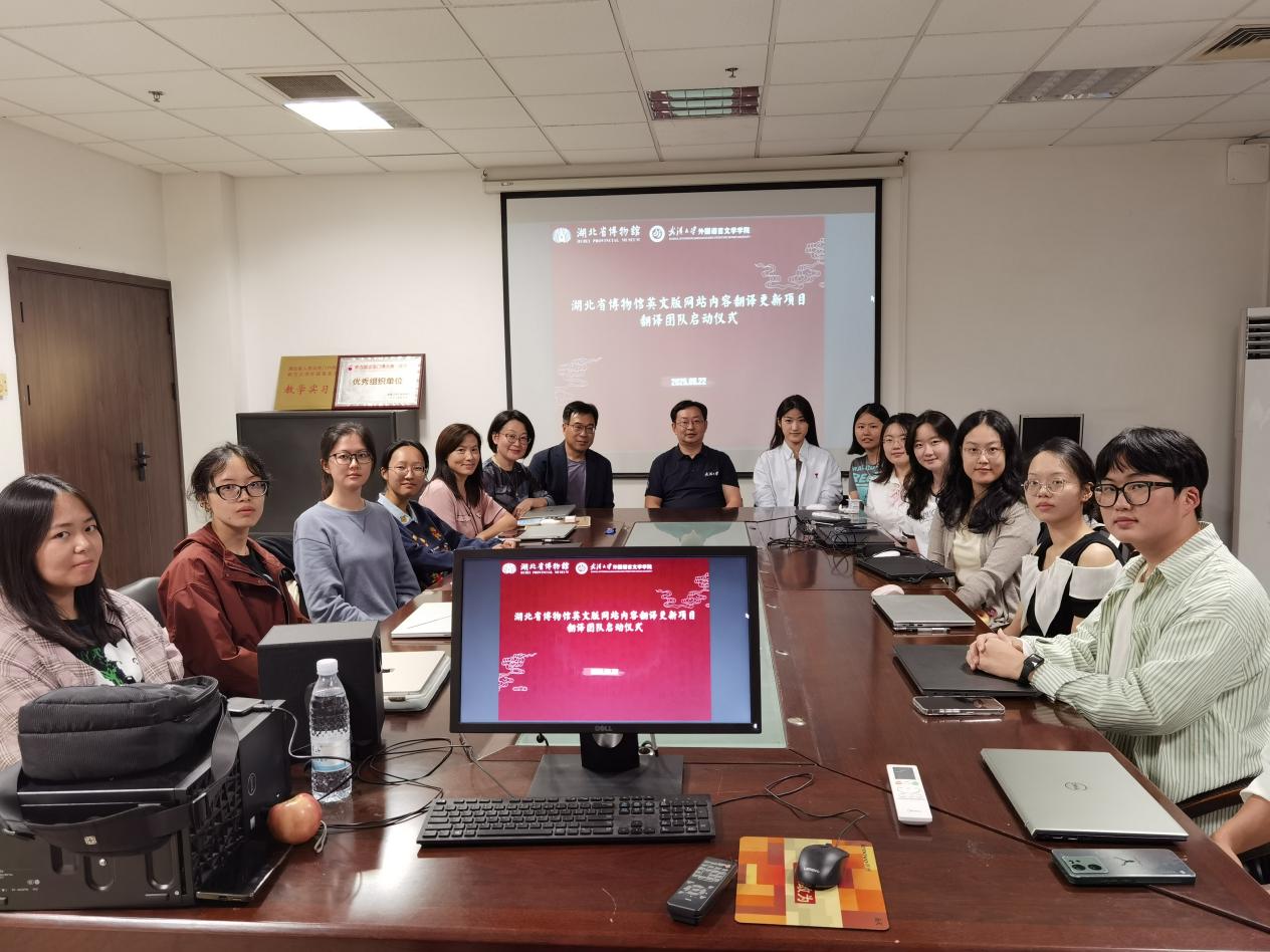 我院翻译系副教授黄敏译审带领的团队凭借专业实力,获得湖北省博物馆及项目中标供应商的信任,承接此项重要任务。为确保高质量完成项目,黄敏老师组建了一支业务精湛、结构合理的团队,吸纳了15名2025级翻译硕士研究生参与。翻译系胡玲副教授、何博副教授担任主要翻译,中国译协海外专家、英国利兹大学东亚研究系Martin Ward教授担任英语母语审校。我院翻译系主任熊伟教授、英国牛津大学博德利图书馆东亚部中文馆读者部主任张博雅博士、英国杜伦大学考古学系长聘助理教授张然博士分别担任荆楚文化、博物馆学与考古学领域顾问,传神语联网网络科技股份有限公司高级产品经理彭利峰担任技术专家。该团队已于9月21日正式成立并举行启动仪式。