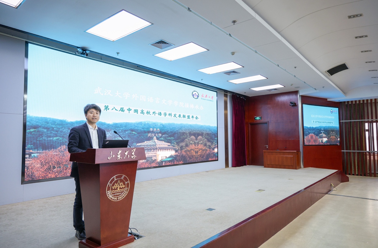 (通讯员:张申威)2025年12月27日至28日,第七届中国高校外语学科发展联盟年会暨人工智能时代外语学科创新发展论坛在山东大学召开。本次会议共吸引北京大学、上海交通大学、武汉大学、北京外国语大学、上海外国语大学等全国160余所高校的200余名外语学科专家参会,与会专家围绕人工智能时代的外语学科创新发展展开深入讨论。院长李圣杰教授在“人工智能背景下外语学科与专业建设”论坛中做主旨发言,分享武汉大学外语拔尖创新人才培养模式的探索与实践经验。同时,经中国高校外语学科发展联盟常任理事会一致同意,我院将于2026年12月承办第八届中国高校外语学科发展联盟年会。
