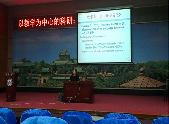 2014年11月27日下午,大学英语部语言学与语言教学系列讲座(三)“以教学为中心的科研:六个故事”在外语学院报告厅成功地举行。本次讲座由外国语言文学学院大学英语部副主任程向莉副教授主持,大学英语部桂敏副教授主讲。