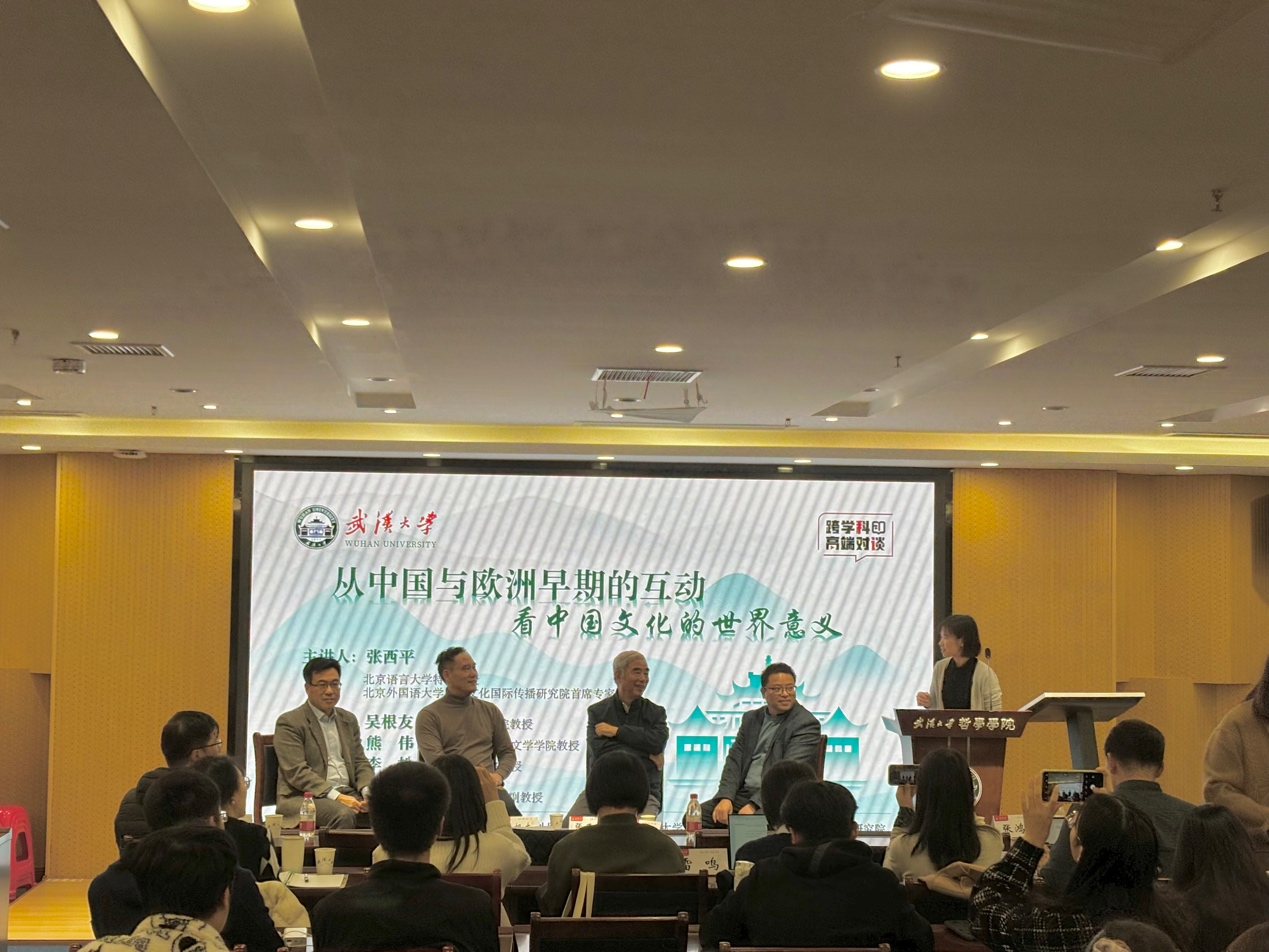2023年11月22日晚7点,由武汉大学外国语言文学学院、武汉大学哲学学院、武汉大学文明对话高等研究院以及“跨文化交流中的经典文本诠释与话语流变”青年团队举办的“从中国与欧洲早期的互动看中国文化的世界意义”跨学科高端对谈在哲学学院B107报告厅顺利举办。此次对谈的主讲人为北京语言大学特聘教授、北京外国语大学中华文化国际传播研究院首席专家张西平教授,与谈人为武汉大学文明对话高等研究院院长、哲学学院吴根友教授,武汉大学外国语言文学学院翻译系主任熊伟教授,武汉大学文学院李松教授。对谈由武汉大学哲学学院廖璨璨副教授主持。
