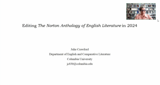 2024年6月21日晚,由武汉大学外国语言文学学院主办,浙江大学中世纪与文艺复兴研究中心协办的“何为文学?”:第三届外国文学与比较文学国际研讨会会前讲座在线上顺利举行。国际知名学者、哥伦比亚大学英文系讲座教授Julie Crawford就即将面世的第十一版《诺顿英国文学选集》的编辑过程与内容进行了约两个小时的学术讲座,来自国内外高校与科研机构的百余名师生参与其中。本次讲座由国际研讨会另一协办方上海外国语大学英语学院院长王欣教授主持,北京大学程朝翔教授、浙江大学郝田虎教授、武汉大学张国庆教授和张鸿彦副教授等出席讲座。